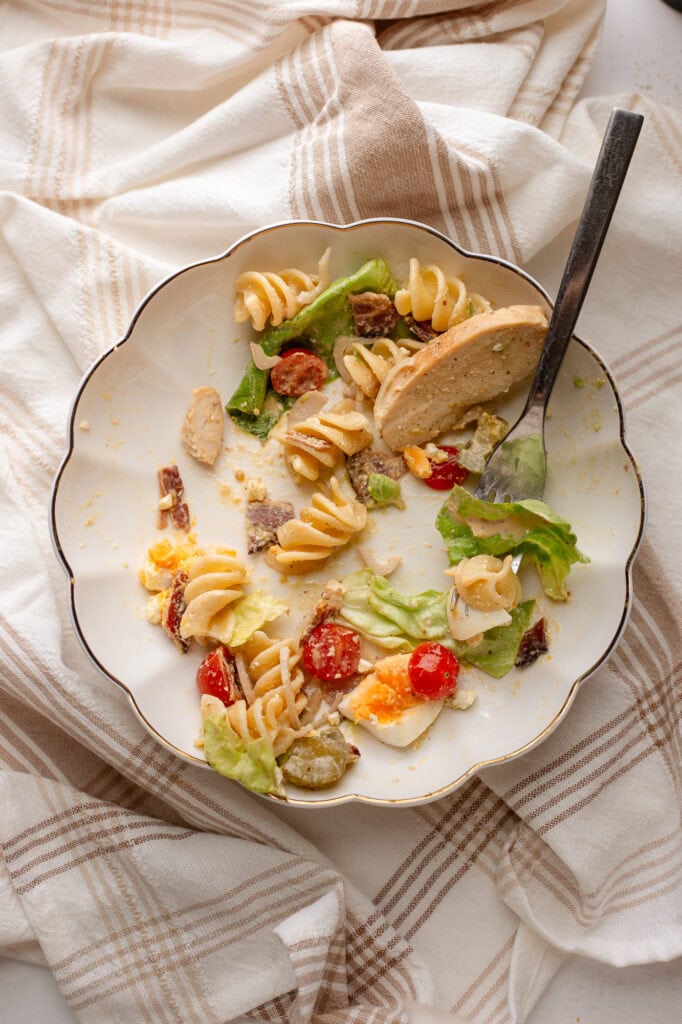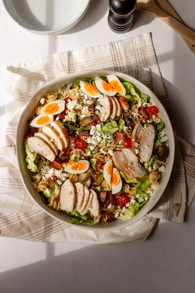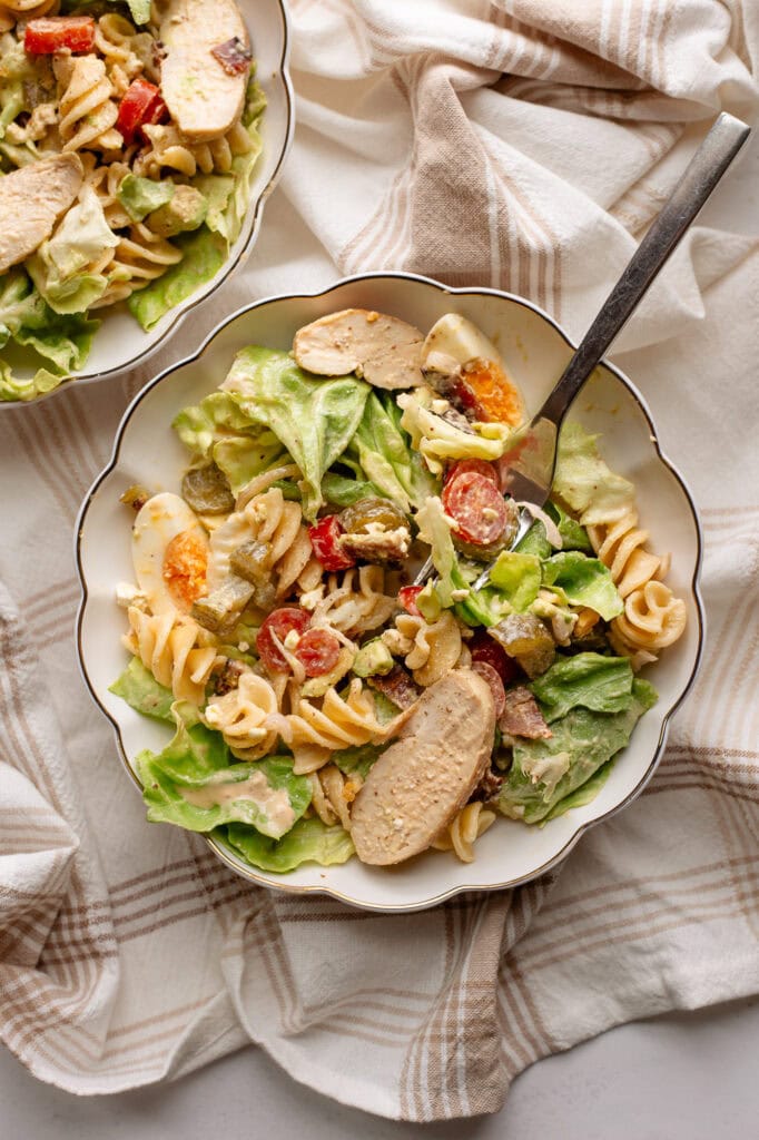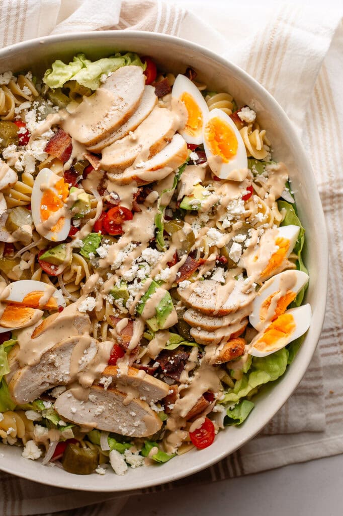 I think my Greek Yogurt Caesar is the way to go for this cobb pasta salad. You can also try my Probiotic Parmesan Vinaigrette dressing. Or you can try it with your favorite store-bought dressing. Seriously, the Greek Yogurt Caesar only takes 10 minutes max to throw together, so give it a try!