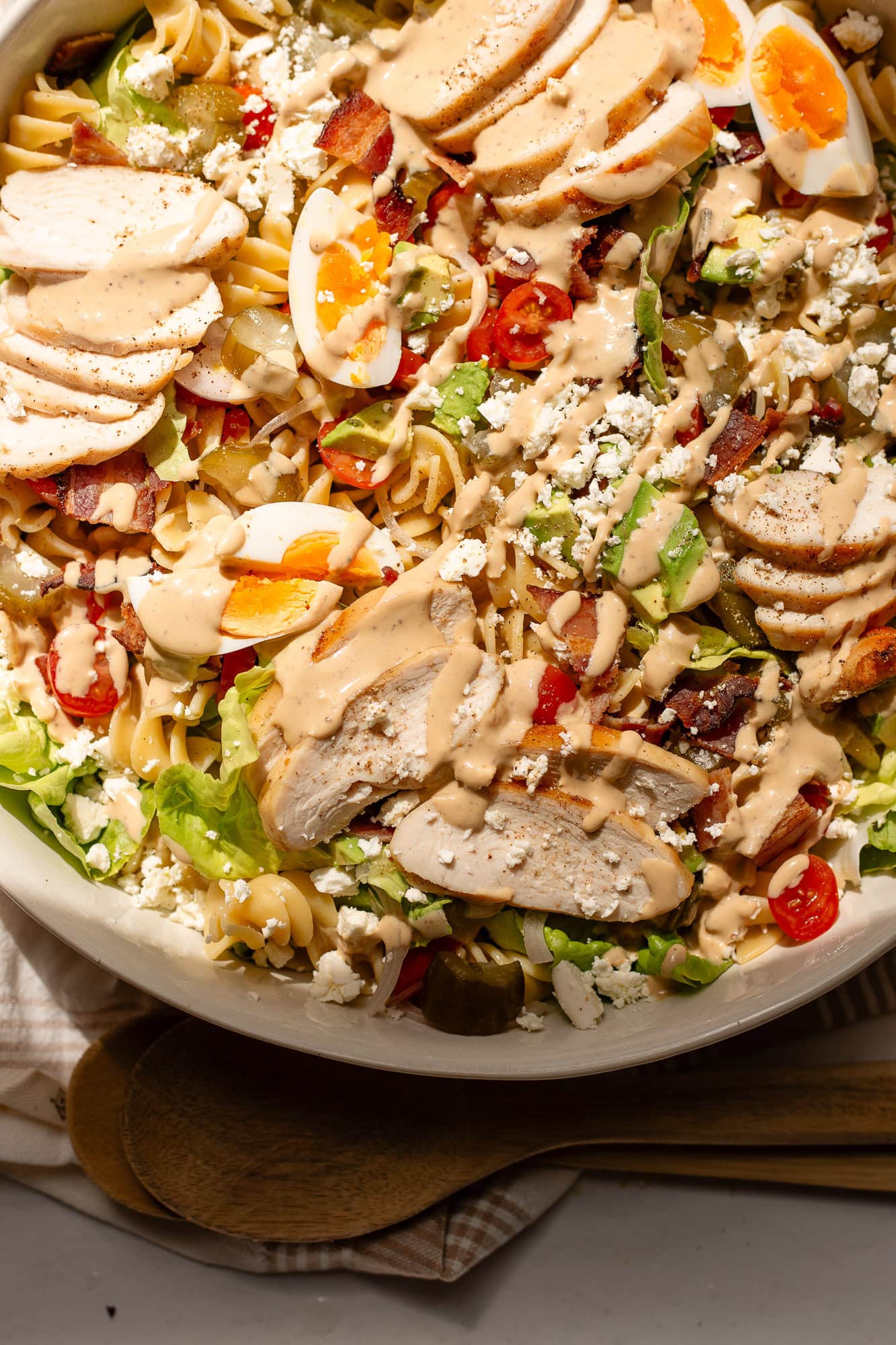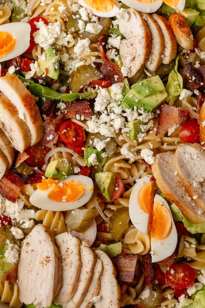I must include a note on lettuce here: I don’t recommend romaine or iceberg lettuce in this cobb pasta salad. Not all lettuce is created equally, and imo romaine and iceberg are not the best for pasta salad. Find yourself some nice fresh butterhead lettuce if you can. If not, sub with mixed salad greens.