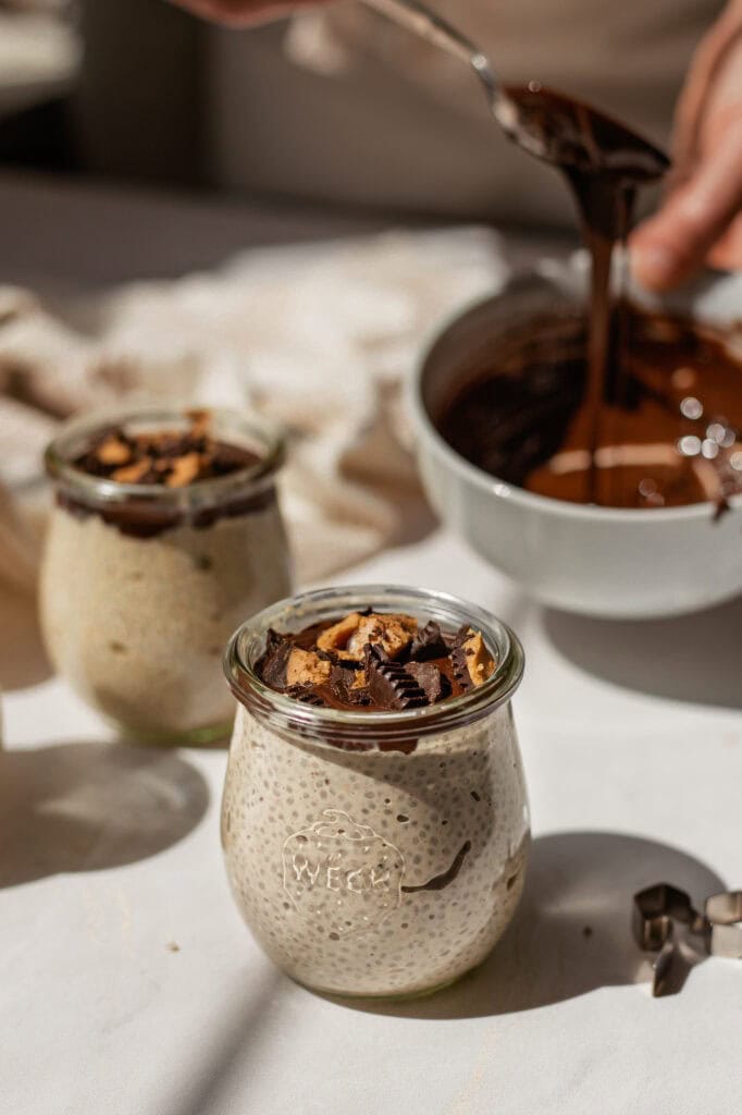 - Add the chocolate topping: Melt the dark chocolate and coconut oil (about 25 seconds in the microwave) and pour in a thin even layer over the peanut butter yogurt chia pudding.