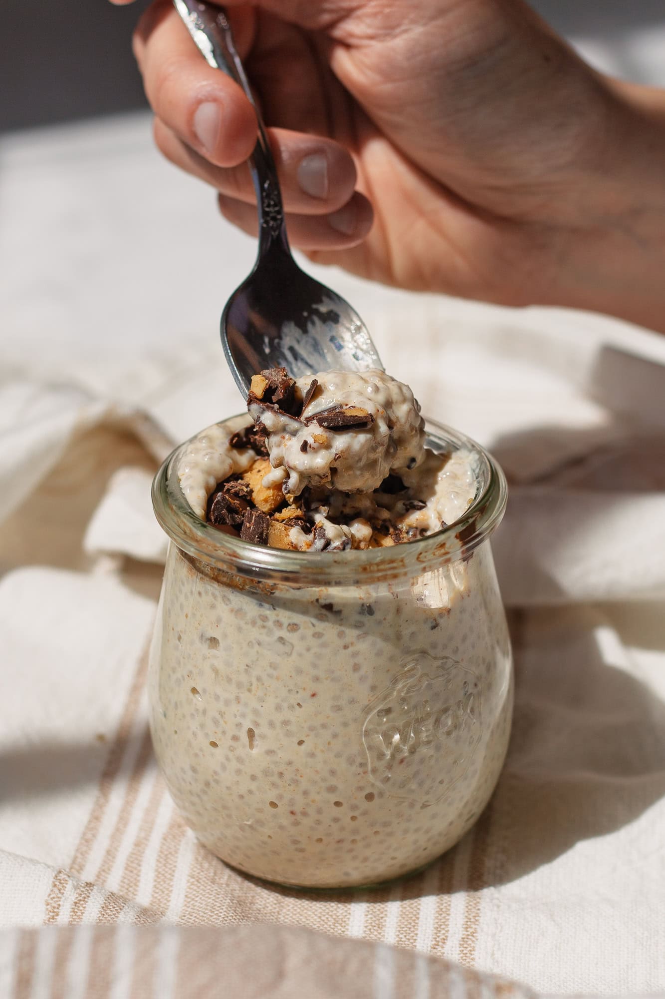 This recipe is extra nourishing, too. You get even more protein by incorporating yogurt. Greek yogurt gives the added benefit of probiotics for gut health. Apart from it being a super nutritious snack, this yogurt chia pudding is delicious! It’s got all the delicious flavor of a peanut butter cup with a yummy chocolate topping. I even crumbled up some mini peanut butter cups to really send it.