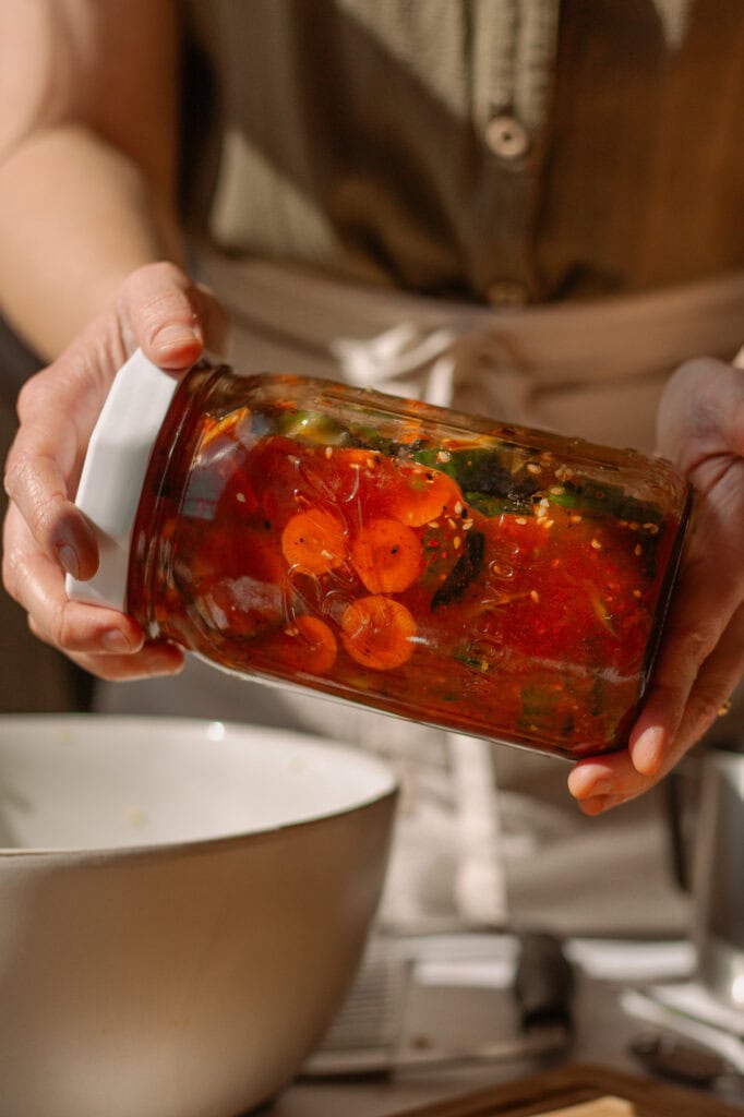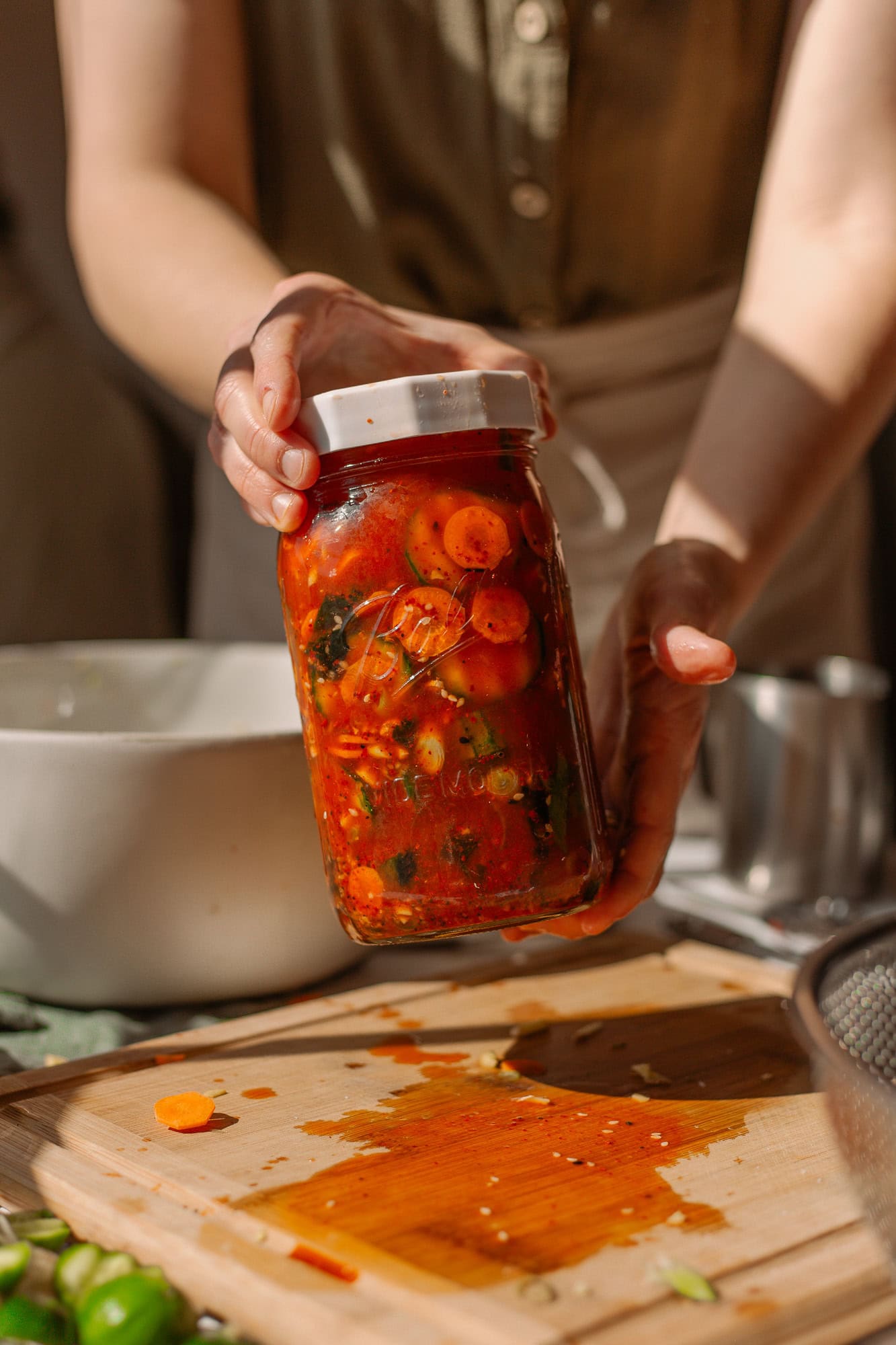 - Let the kimchi pickles ferment for 14 days at room temperature. Set the jar in a glass dish to catch any spills.
