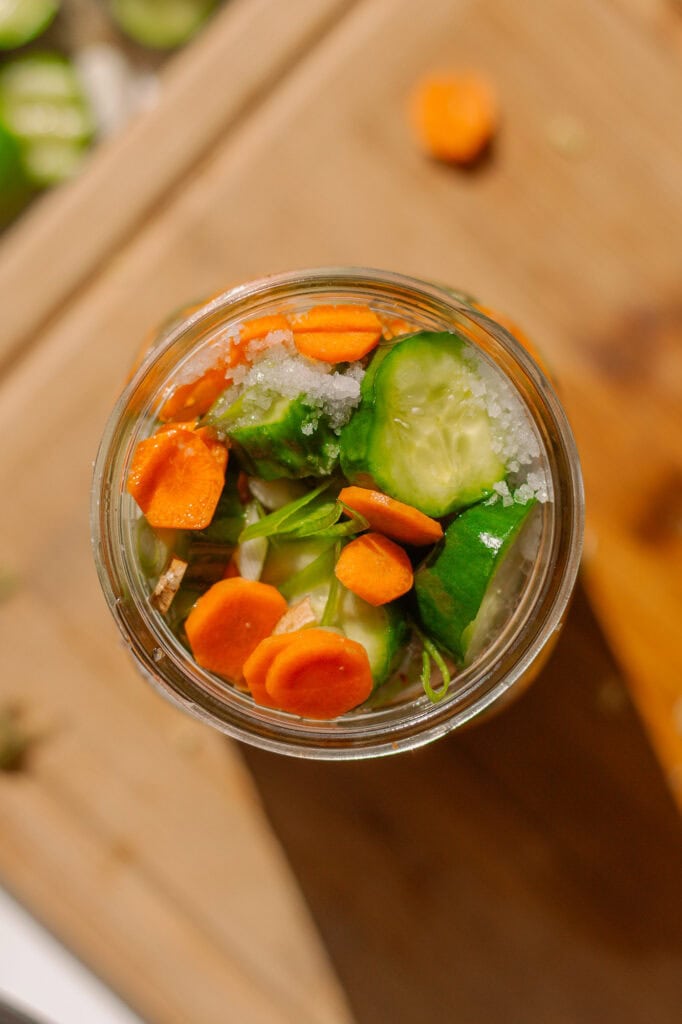 - Add everything to the mason jar. (It helps if you put anything cut small, like green onion and seaweed, below the cucumbers to keep them from floating)