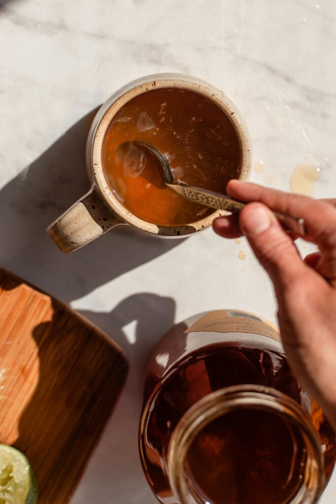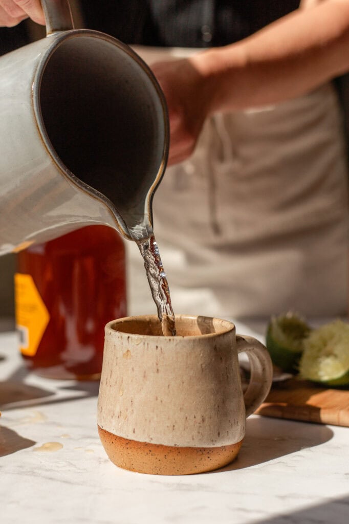 The only way I really love using my oxymel is by making a hot or iced tea. I combine two tablespoons of oxymel, two tablespoons of lime/lemon juice, one teaspoon of honey, and 12 ounces of water. I prefer to drink it with hot water when I’m having allergies or a sore throat, and prefer cool water for a summer herbal iced tea.