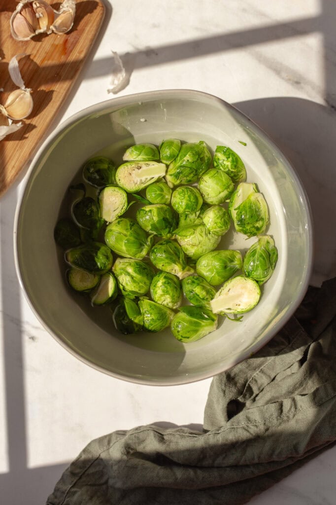 - Slice all the Brussels sprouts in half, and slightly crush and peel the garlic cloves.