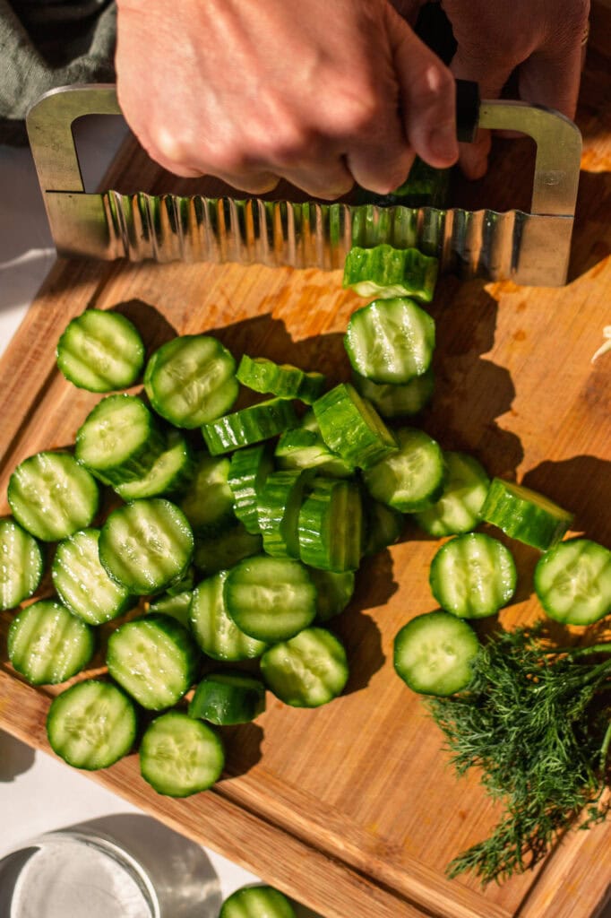 There are two slicing techniques I recommend when fermenting any sort of pickles. For pickle chips, a ripple-cut pickle holds up better than a straight-sliced pickle. You can get a cheap and simple ripple cutter by clicking here.