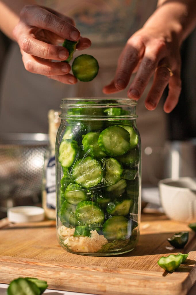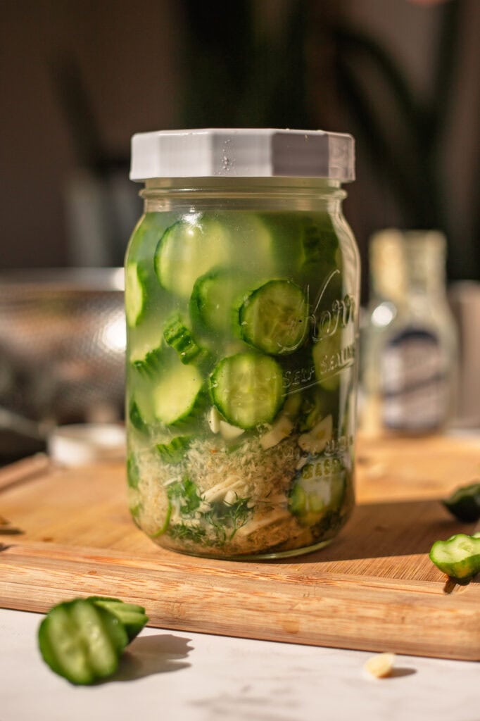- Add everything to the mason jar. (It helps if you put anything cut small, like garlic and horseradish, below the cucumbers to keep them from floating)