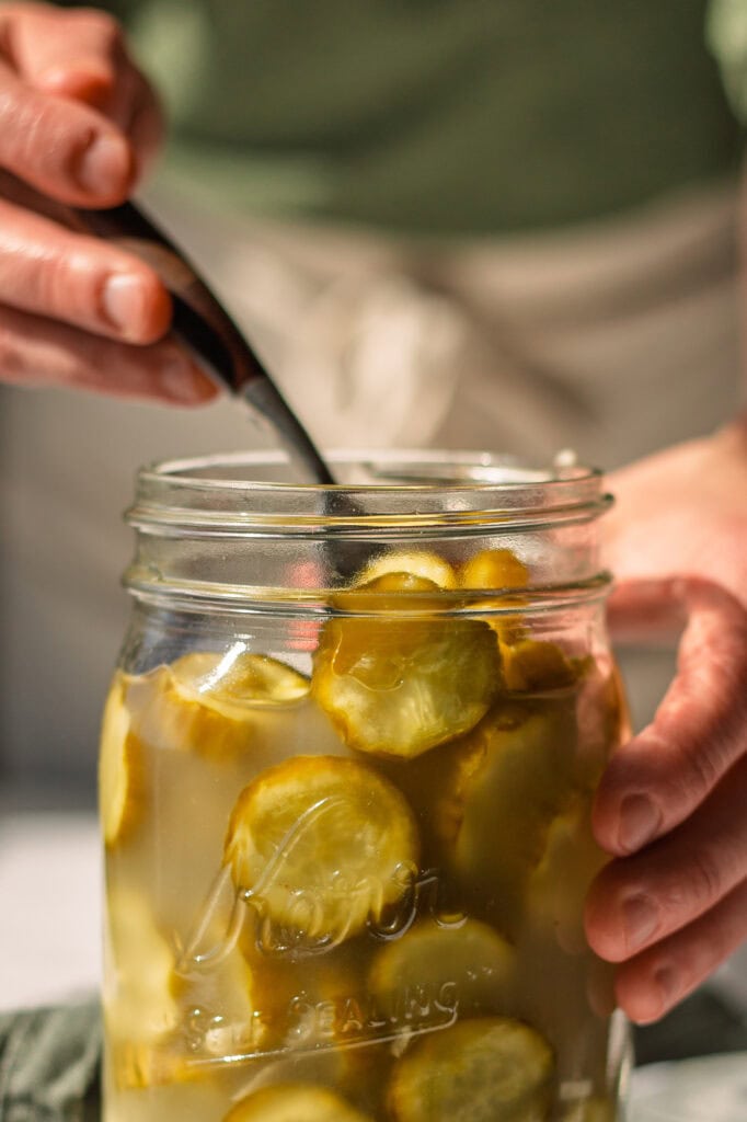 I also suggest fermenting pickle spears or halves, which tend to hold up even better than pickle chip slices. Spears and halves can be cut with a regular knife.