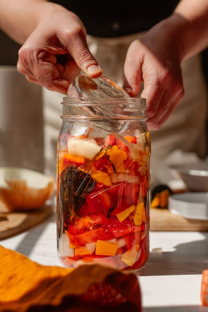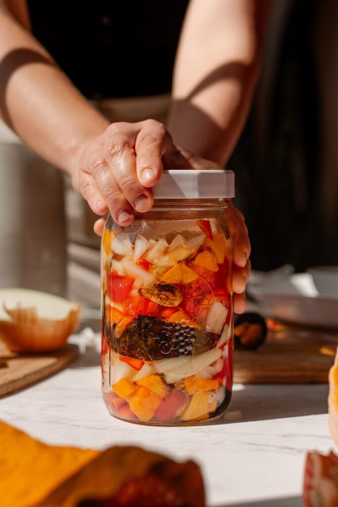 This hot sauce is naturally thick and emulsified, with no need for cooking, added ingredients, or emulsifiers. I have a secret ingredient for this perfect, smooth, fermented hot sauce texture–it’s butter nut squash! (or any winter squash, including pumpkin). When lactic acid bacteria ferment the starches in winter squash, they naturally convert them into emulsifying compounds called exopolysaccharides. So when we blend our hot sauce after fermentation, there’s no watery separation in the bottle!
