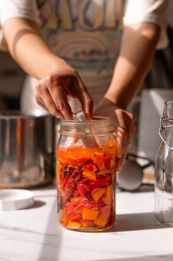 - Add the rest of the ingredients, into the mason jar with the salt water. You will need to mash the peppers into the jar with a tamper or wooden spoon to pack them in, as you do the brine will come up.