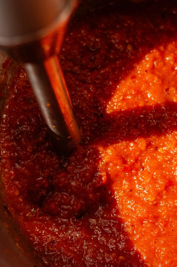 Since you strain the sauce, you will have some pepper pulp left over. Please do not throw it away! Put it in a mason jar and keep it to cook with. It is fantastic in soups, stews, braises, and especially ramen.