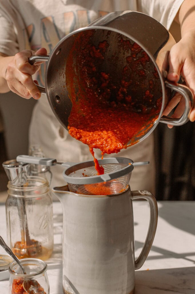 - Place a colander over a large pitcher or pot and strain the sauce. You can mash the pulp in the colander with a spoon to get all the juices out. (don’t forget to save the pulp! put it in a little jar to use in cooking.)