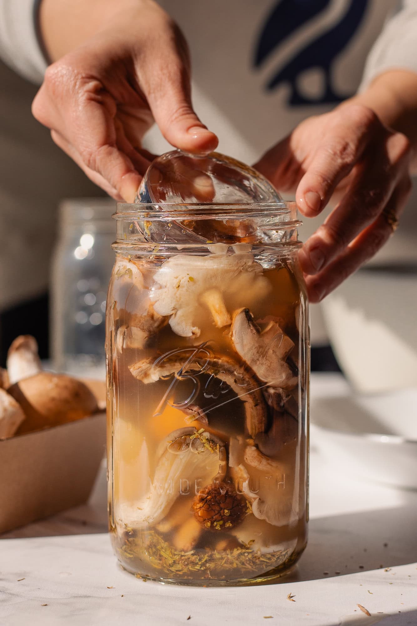 - Place a fermentation weight in the jar to keep the mushrooms submerged. Close the jar with a rust-proof lid.