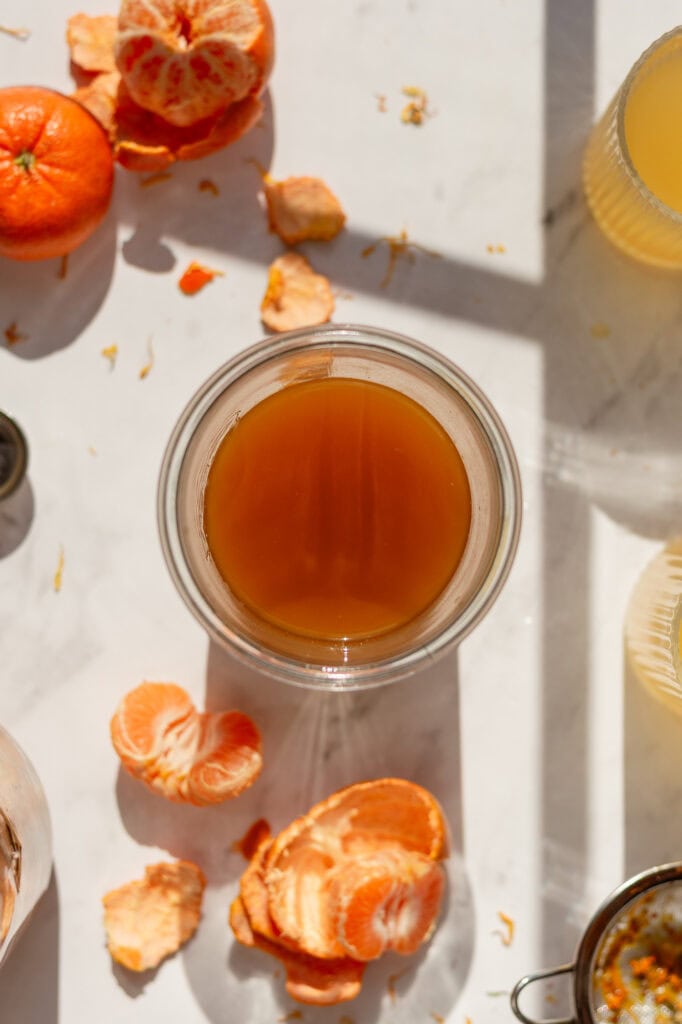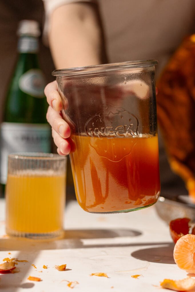 While you can, I don’t recommend drinking it straight up, as it’s very acidic. It’s best enjoyed as a mixer. My go-to is drinking three tablespoons of shrub vinegar topped with sparkling water. Usually in a 12-ounce glass. You can mix it into some still water or apple juice, too. Any way you mix it, it’s a great apéritif (pre-meal digestive drink).