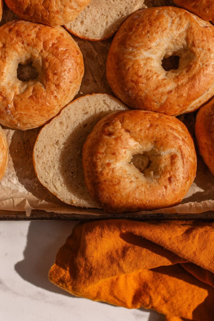 The robust gluten network formed by bread flour helps the bagels hold their shape during boiling and baking, ensuring they have a nice crust and tender, chewy interior. Additionally, choosing organic bread flour means you’re opting for a product free from synthetic pesticides and additives, which can contribute to a cleaner, more wholesome bagel. All in all, organic bread flour is an essential ingredient for homemade bagels. It’s also good to keep on hand for making sourdough pizza crust!