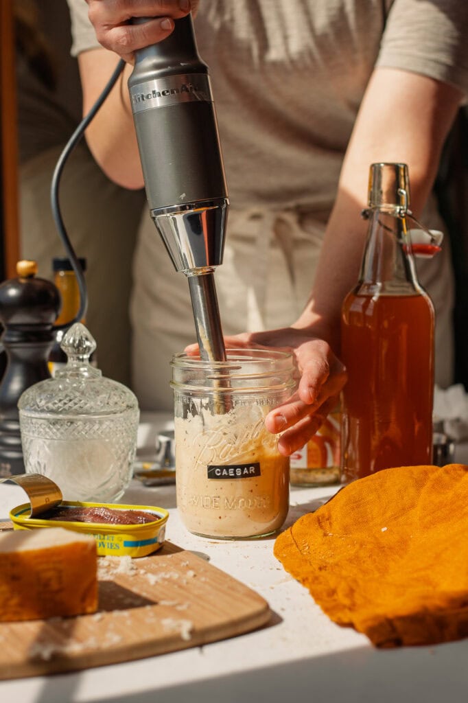 Forget store-bought dressings. Once you try this homemade Greek yogurt Caesar salad dressing, you’ll never go back! It’s super easy too, just throw all the ingredients in a wide mouth jar and blend.
