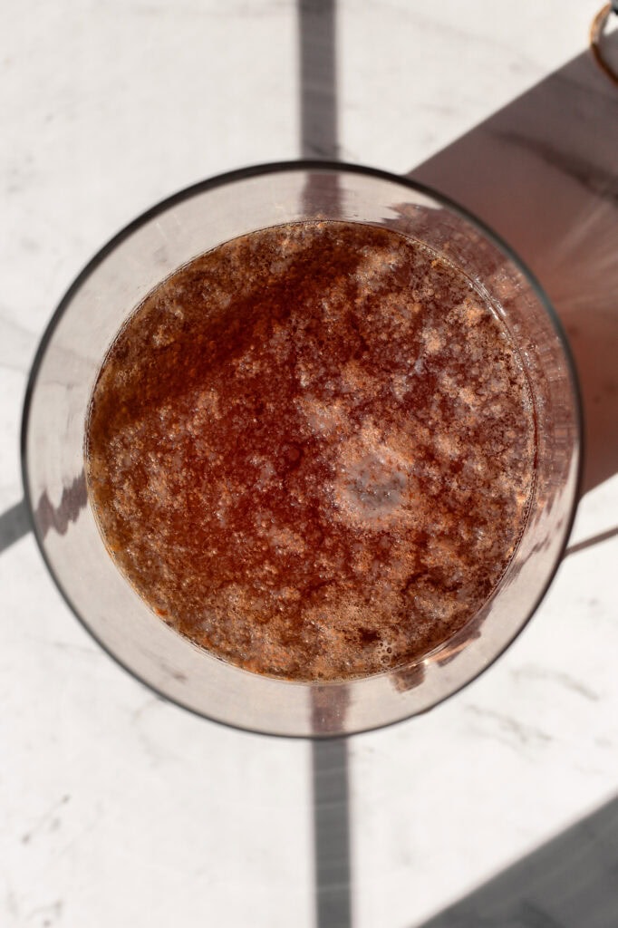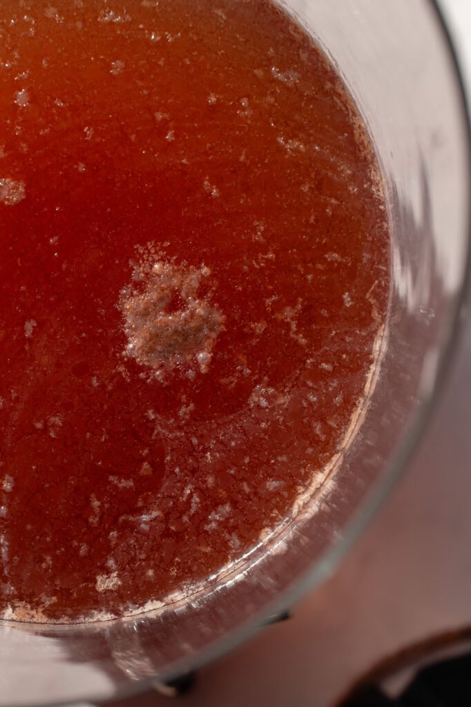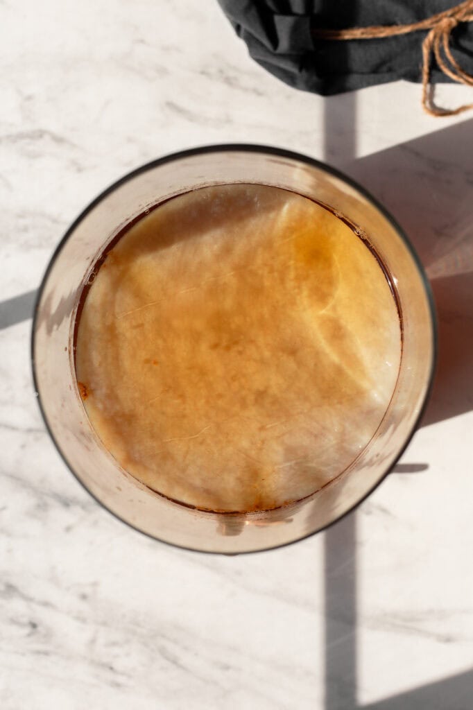 A healthy SCOBY should be off-white to light caramel in color. If you ever see fuzzy blue, green, white, black, or gray spots forming on the surface of the SCOBY or the sides of the jar, that’s mold—and unfortunately, it means the batch is unsafe. Mold spores spread throughout the liquid, so scraping it off won’t fix the issue. If mold appears, discard everything and start fresh.