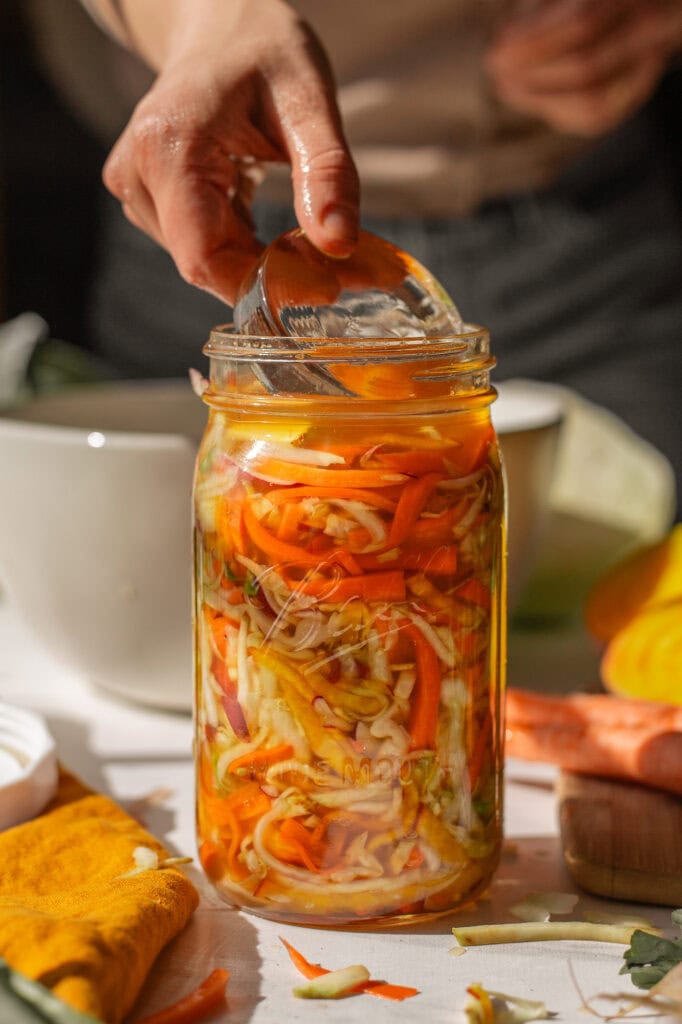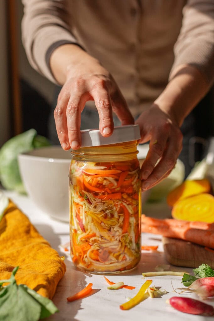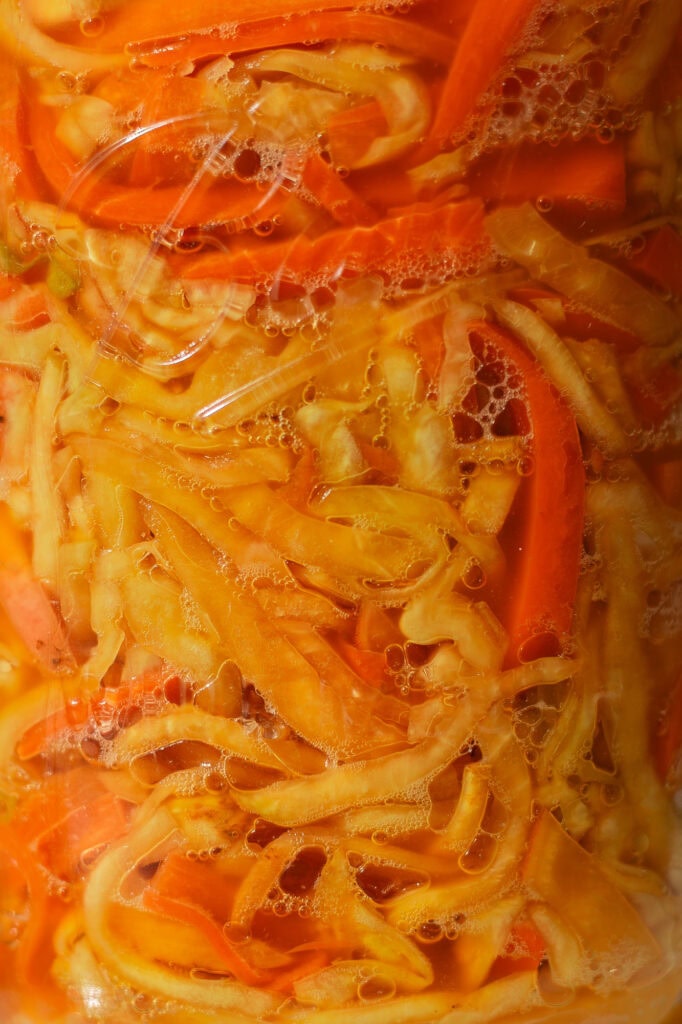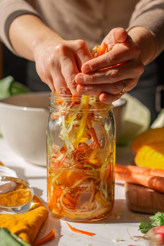The key point is that red cabbage and beets are higher-FODMAP ingredients. This means there’s more sugar in the mix than with something like Jalapeno Sauerkraut. As long as you use the recommended amount of salt, keep everything submerged, and keep the lid clean, you shouldn’t have any issues.