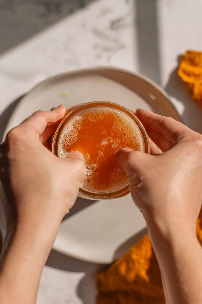 - Secure the lid (You do not need to tighten it all the way. Just secure the lid but leave it ever so slightly loose, so the gas doesn’t build up too much). You can keep the jar in a glass dish to catch any spills.