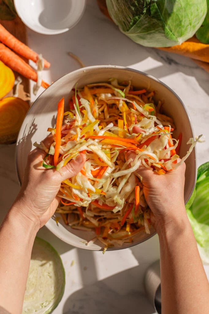 - Chop the cabbage and roots. You can slice, grate, or chop the roots however you’d like (I like to cut them into thin strips).