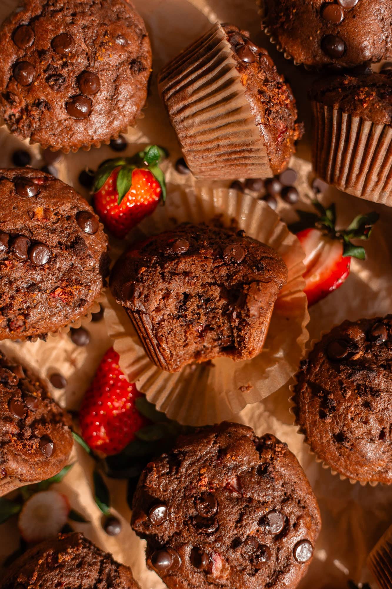 The fermentation process that happens with sourdough starters enhances the nutritional profile of many bread products. In sourdough starters, lactic acid bacteria break down gluten, fructans, and phytic acid. This can be particularly beneficial for individuals with gluten or FODMAP sensitivities. If you long ferment the batter for these chocolate strawberry muffins overnight in the fridge and like how it comes out, let me know in the comments!